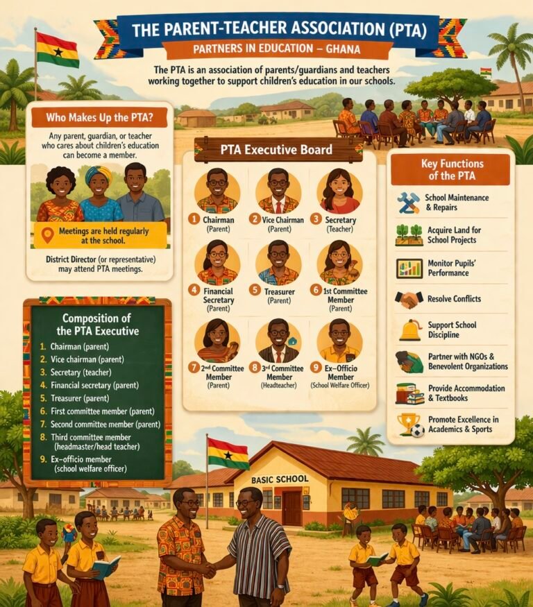 A PTA is a formal group within a school made up of parents or guardians and teaching staff. In many public basic schools, see Parent-Teacher Association composition and roles in Ghana PTAs operate alongside School Management Committees (SMCs), with a stronger emphasis on parental participation and community engagement.